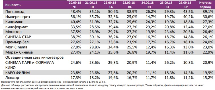 Заполняемость залов в период с 09.08.2018 по 26.09.2018