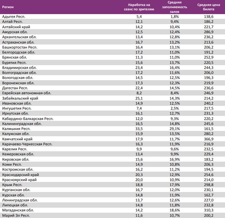 Основные показатели кинопроката в регионах Российской Федерации