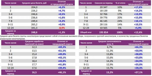 Показатели работы кинотеатров в зависимости от количества залов по фильмам ТОП-12