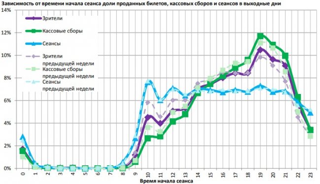Распределение доли зрителей, сеансов и кассовых сборов по времени начала сеанса