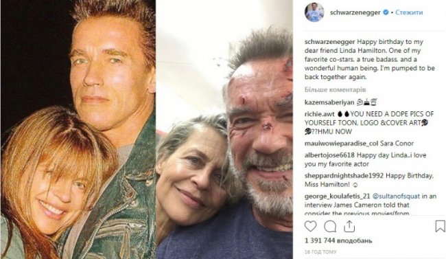 26 сентября Шварценеггер выложил в соцсети свежий совместный снимок, который сопроводил теплыми поздравительными словами: "С днем рождения, моя дорогая подруга Линда Хэмилтон. Одна из моих самых любимых звезд, по-настоящему крутая, ну и просто замечательный человек. Я очень взволнован снова быть вместе".