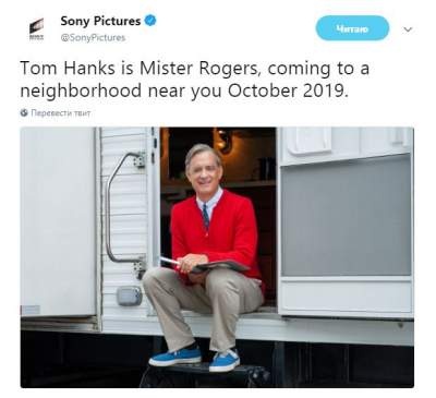 Телекомпания Sony Pictures в своем официальном Твиттере опубликовала первую фотографию с изображением Тома Хэнкса в роли популярнейшего в США телеведущего Фреда Роджерса.