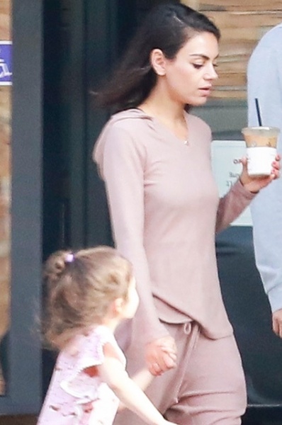 Предпочитающие в обычной жизни комфортную и спортивную одежду Мила и Эштон и на этот раз остались верны себе. Одевалось семейство явно сообща: Мила облачилась в бриджи и легкую толстовку нежно-розового цвета и белые кроссовки. В той же цветовой гамме была одета и Уайетт. Она, словно маленькая принцесса, предпочла очаровательное платьице с оборками.