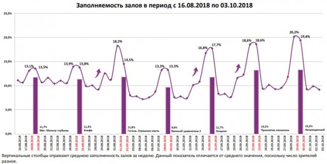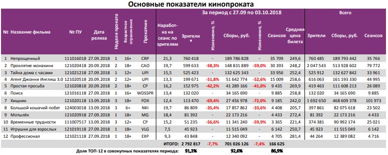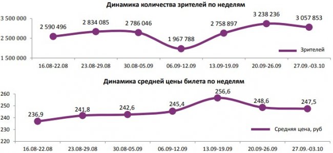 Как показывает индустриальная статистика с 27 сентября по 3 октября (неделя №39), на первой неделе октября посещаемость российских кинотеатров превысила планку в 3 млн зрителей. Почти 30% билетов от общего числа пришлось на долю драмы с Дмитрием Нагиевым «Непрощенный».