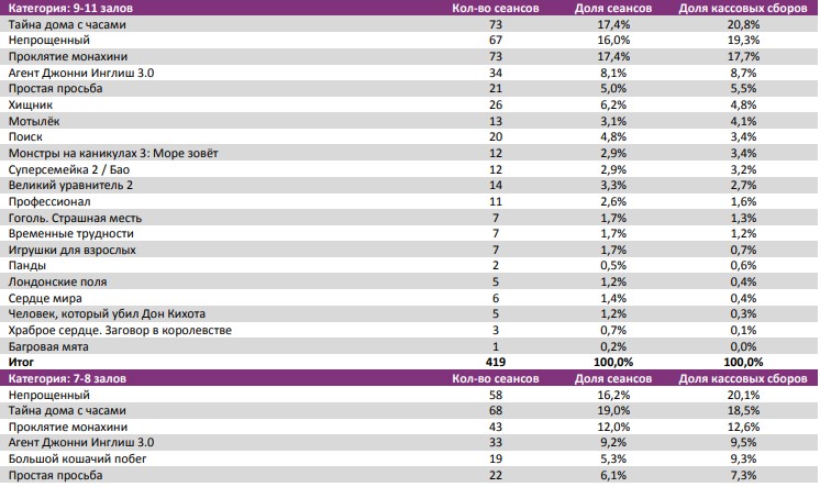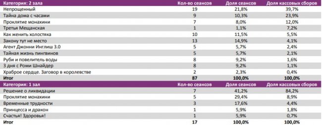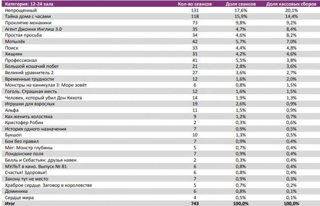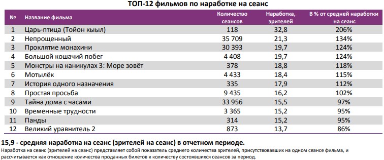 Драма «Непрощенный» привлекла в кинотеатры 760 тыс. зрителей, что выше показателей «Землетрясения». Рубеж в 500 млн рублей и 2 млн посещений преодолел хоррор «Проклятие монахини».