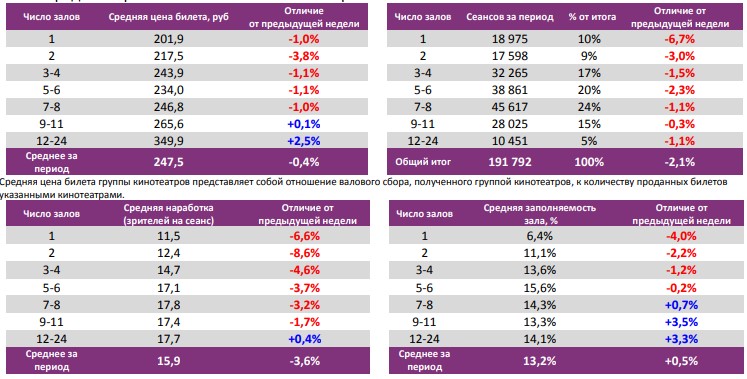 Средняя наработка релизов ТОП-12 в зрителях на сеанс в зависимости от количества залов
