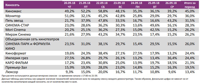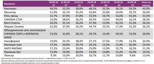 Фильм-лидер недели: «Непрощенный». Лидером среди киносетей на фильме-лидере стал Киномакс, показавший очень высокую заполняемость – 45%.