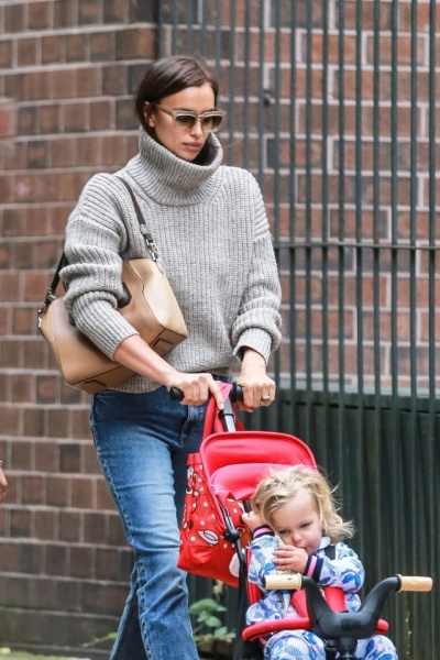 А сегодня Ирина появилась с малышкой Леей без Брэдли. Видимо, папа занят на площадке. Для выхода модель выбрала серый свитер, джинсы и кроссовки. На стиле!