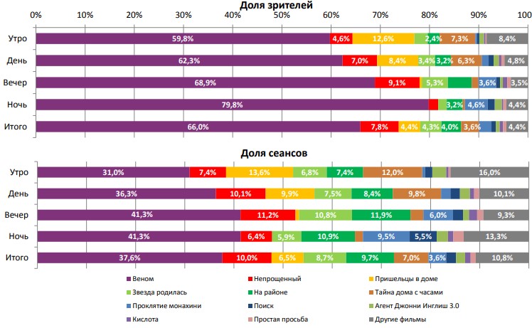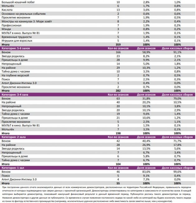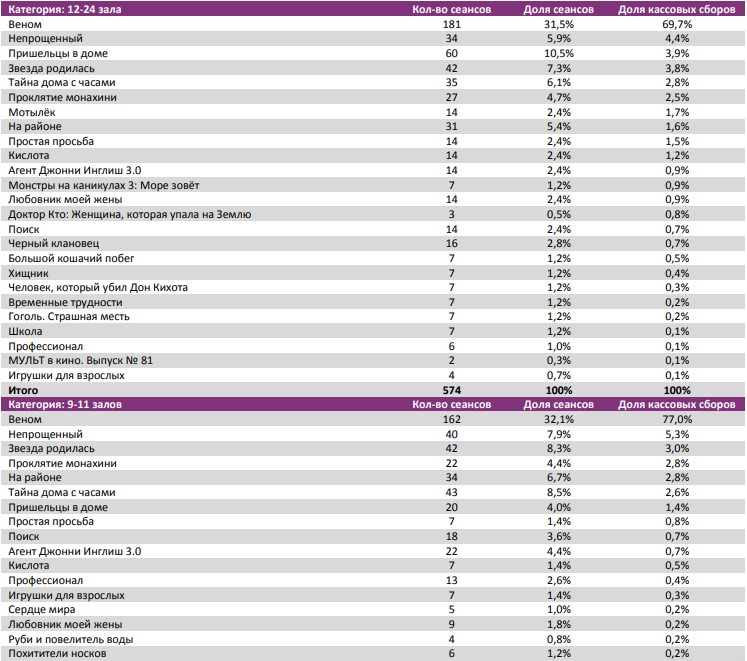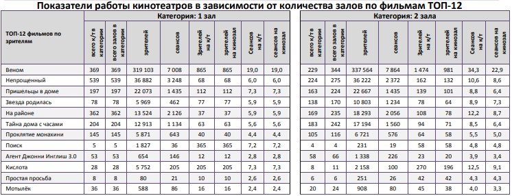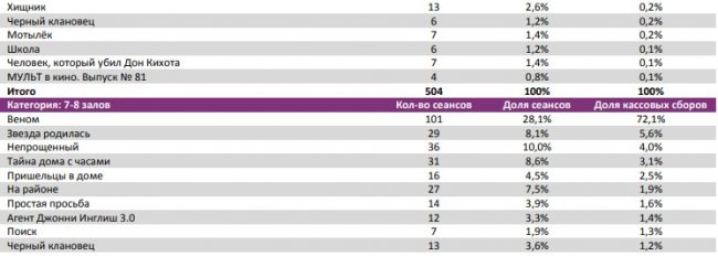 «Веном» стал лидером во всех самых успешных кинотеатрах недели, показав долю сборов 70-100%.