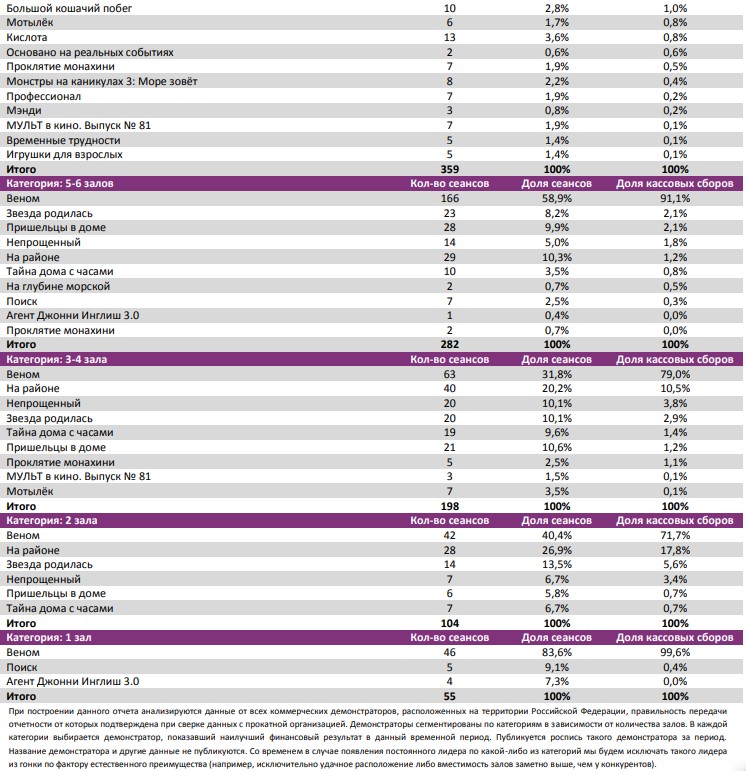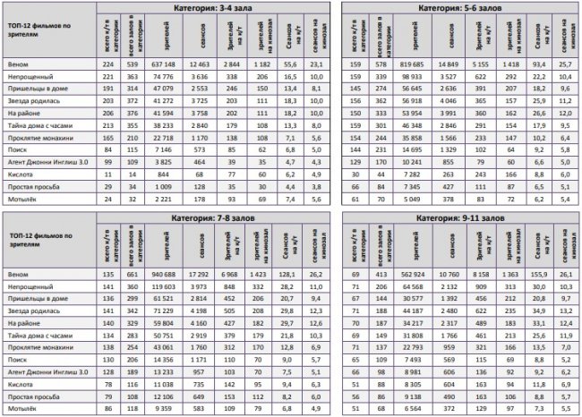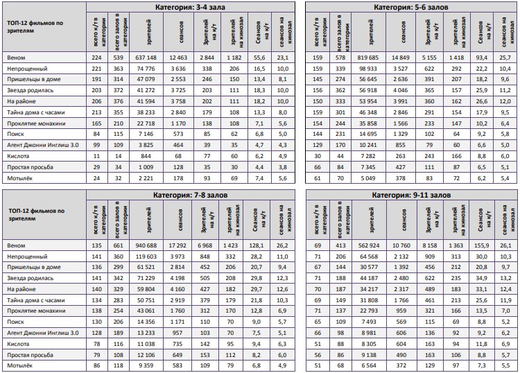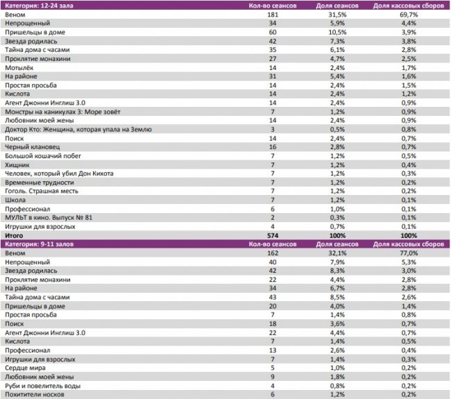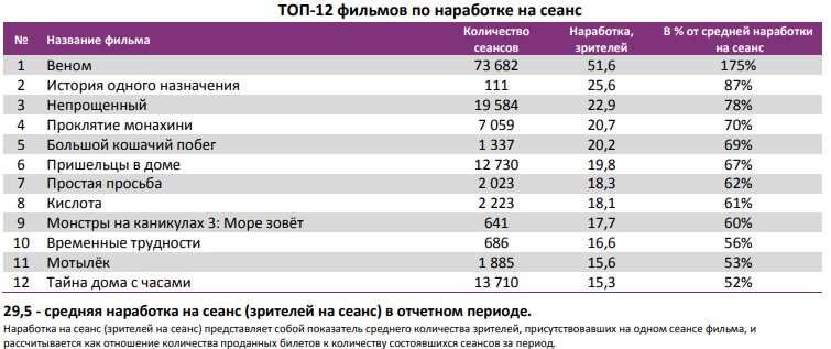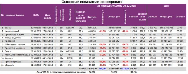 «Веном» за первую неделю посмотрело 3,8 млн зрителей, что позволило фильму собрать в прокате больше 1 миллиарда рублей. Лишь 44% сборов потерял «Непрощенный» с Дмитрием Нагиевым, выступив на второй неделе лучше, чем «На районе» с Данилой Козловским на первой. Фильм Александра Горчилина «Кислота» привлек в кинотеатры 43 тыс. зрителей.