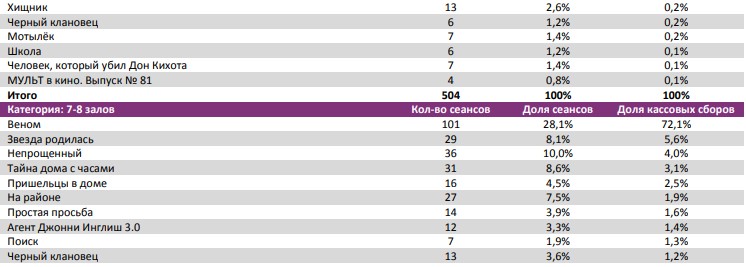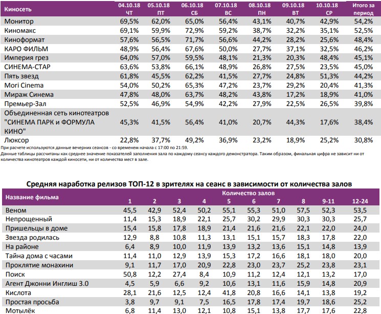 Фильм-лидер недели - «Веном». Заполняемость залов на его сеансах была наибольшей в кинотеатрах сети «Монитор» - выше 50%.