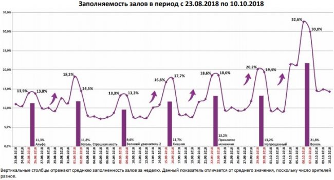 Как показывает индустриальная статистика с 4 по 10 октября (неделя №40), на второй неделе октября посещаемость российских кинотеатров резко возросла до 5.8 млн. зрителей благодаря выходу кинокомикса «Веном», на долю которого пришлось 66% проданных билетов.