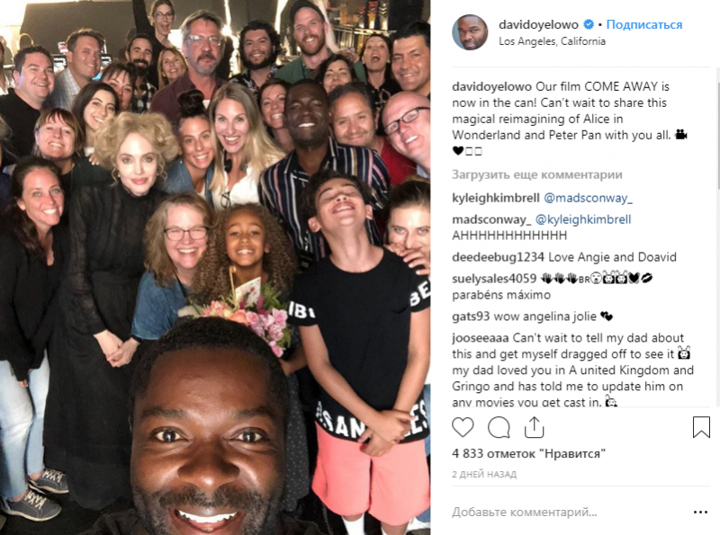 Стоит отметить, что 43-летняя актриса снималась в приквеле двух сказок "Алисы в Стране чудес" и "Питера Пэна". Джоли появилась на общем снимке с последнего съемочного дня на странице Дэвида Ойелоуо в Instagram.