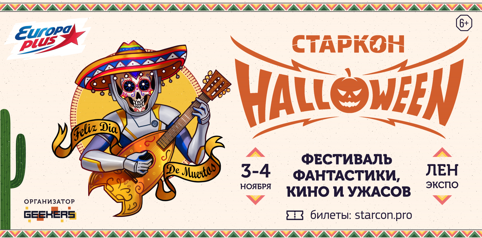 3 и 4 ноября в Санкт-Петербурге в выставочном комплексе «Ленэкспо» в третий раз состоится фестиваль фантастики, кино и ужасов Старкон: Хэллоуин. Главной темой этого года стал красочный мексиканский праздник D?a de los Muertos. Атмосфера пугающего Хэллоуина и яркого Дня Мёртвых, два праздника на одном мероприятии. Старкон: Хэллоуин – это 10 интерактивных стендов и зловещих декораций, карнавал оживших мертвецов, 500 участников в образах любимых персонажей, увлекательный квест с призами по культовым хоррор-вселенным, уникальная тематическая ярмарка, премьеры фильмов, общение с художниками, блогерами и крупнейшая мексиканская вечеринка. Старкон порадует крутыми фильмами, премьерами и встречами со звёздами кино. На фестивале состоятся презентации стимпанк фильма «Эбигейл» и фильма ужасов «Рассвет». Режиссёр короткометражного фильма «Papers, Please» привезёт эксклюзивные материалы своей новой работы по мотивам игры «Beholder». «Проклятие монахини» и «Оверлорд» бесплатно покажут для посетителей в рамках «Ночи киноужасов». Для любителей приключений сквозь время и пространство пройдёт специальный показ первой серии нового сезона «Доктор Кто». Арт-зона Старкона познакомит с десятками художников, скульпторов и авторов графических романов. В программе творческие лекции, встречи с известными блогерами. Будет работать зона анимации, пройдут интересные мастер-классы. Традиционно на фестивале состоится конкурс косплея, жюри выберет самые страшные образы. Два дня фееричного шоу и выступлений на главной сцене. Сотни участников из разных городов России приедут побороться в десяти номинациях. В этом году на вечеринке к зомби, вампирам и прочей нечисти присоединятся духи из потустороннего мира. Зажигательная музыка, конкурсы, мексиканская кухня и специальный бар в антураже чарующего D?a de los Muertos. Вечеринка откроет двери для совершеннолетних посетителей фестиваля 3 ноября в 21:00. Старкон: Хэллоуин – это праздник для всех. В 2003 году ЮНЕСКО внесла День Мёртвых в список нематериального культурного наследия человечества. Чтобы прочувствовать атмосферу веселья не обязательно покупать дорогой костюм. Сомбреро и накладные усы, грим можно сделать на месте. Приходите с друзьями и детьми, ужасаться и развлекаться 3 и 4 ноября! Успейте приобрести билет на самую страшно-фантастическую тусовку: starcon.pro Расписание фестиваля: Суббота 3 ноября: 12:00 – 20:00 1 день фестиваля 13:00 – 13:40 Церемония открытия на главной сцене 12:00 – 20:00 Лекции и мастер-классы в Арт-зоне 14:00 – 2:00 Кинозал 21:00 – 4:00 Вечеринка «D?a de los Muertos» (18 ) Воскресенье 4 ноября: 12:00 – 21:00 2 день фестиваля 14:00 – 20:00 Кинозал 12:00 – 20:00 Лекции и мастер-классы в Арт-зоне Оставайтесь с нами и получайте свежие, подборки и новости о кино первыми, только у нас все новости из первых уст! _