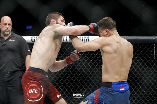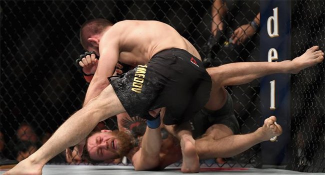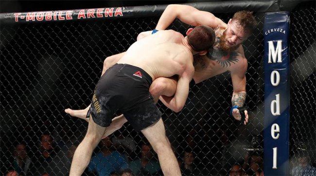 Впервые в истории UFC результат объявляли без победителя и без проигравшего. Оба бойца и члены их команд ушли с арены по требованию организаторов. В итоге победителя — Хабиба Нурмагомедов — объявили при пустом ринге. Чемпионский пояс вынесли и, не вручив, унесли.