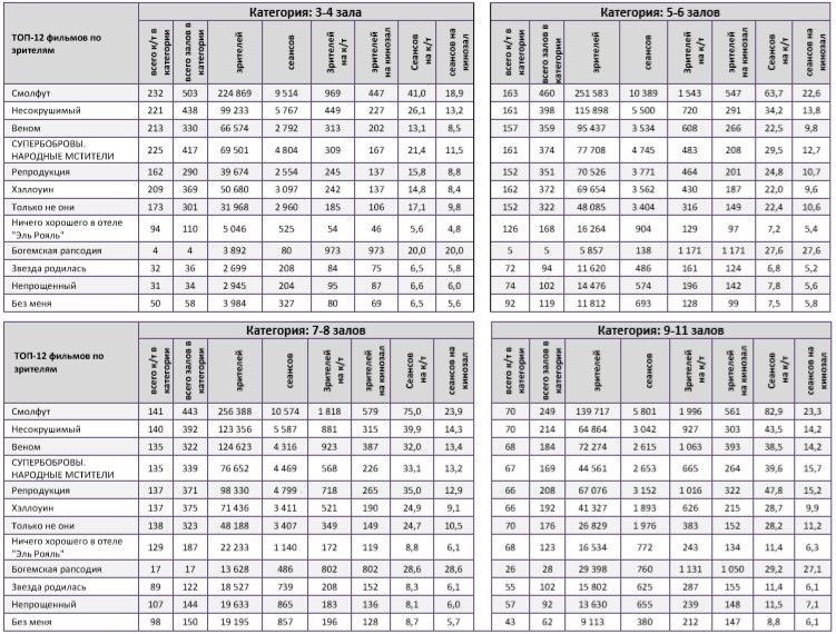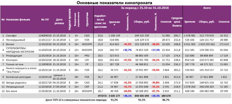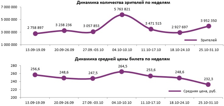 Как показывает индустриальная статистика с 25 по 31 октября (неделя №43), на последней неделе октября посещаемость российских кинотеатров возросла до 4 млн зрителей, в том числе благодаря школьным каникулам. Почти треть билетов была продана на анимационный фильм «Смолфут».
