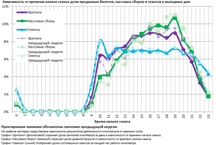 Статистика Фонда кино отражает информацию об основных результатах проката, лидерах недели по сборам и наработке на сеанс, показателях работы кинотеатров, эффективности репертуарного планирования, а также о соотношении долей по сборам, зрителям и сеансам в рамках данного периода.