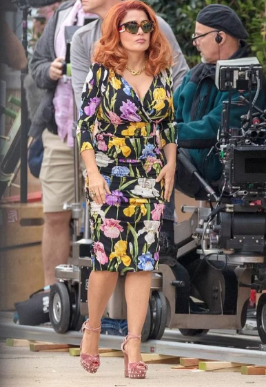 Днями ранее актриса продемонстрировала, как выглядит блондинкой. А в этот раз звезда примерила другой яркий парик и стала настоящей рыжеволосой красавицей в облегающем платье с цветочным принтом. Образ Сальмы дополняли вельветовые босоножки на высоких устойчивых каблуках и солнцезащитные очки.