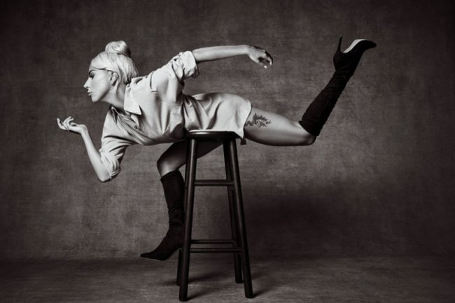 Леди Гага позировала в черной шляпе и длинных черных сапогах на каблуках. В качестве реквизита артистка использовала деревянный стул.