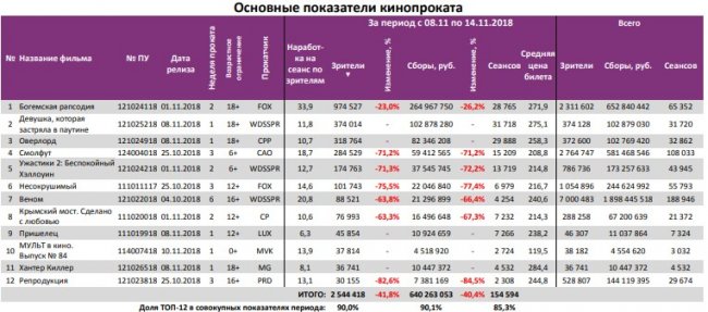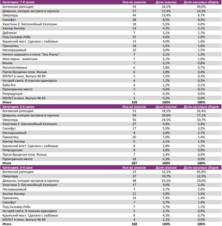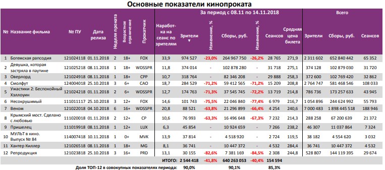 Лидерство в прокате сохранила «Богемская рапсодия», потерявшая лишь 23% сборов, при падении остальных релизов топ-12 от 63% до 83%. Общие сборы байопика составили уже свыше 650 млн рублей. Одинаковые результаты демонстрируют две новинки – триллер «Девушка, которая застряла в паутине» и хоррор «Оверлорд» - 103 млн рублей (но с учетом превью в IMAX последнего).