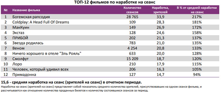 Фильм-лидер недели - «Богемская рапсодия». Среди киносетей максимальную заполняемость на его сеансах показал «Киномакс» - 47%.
