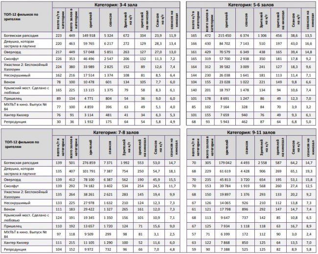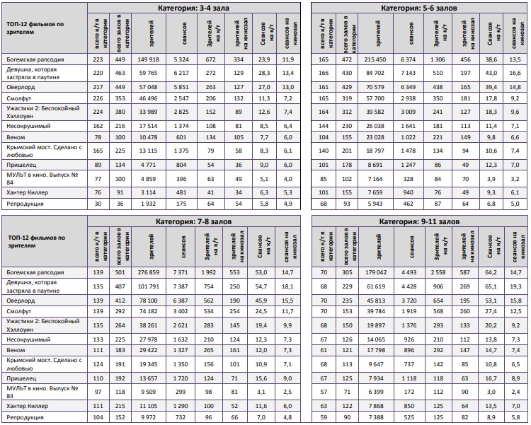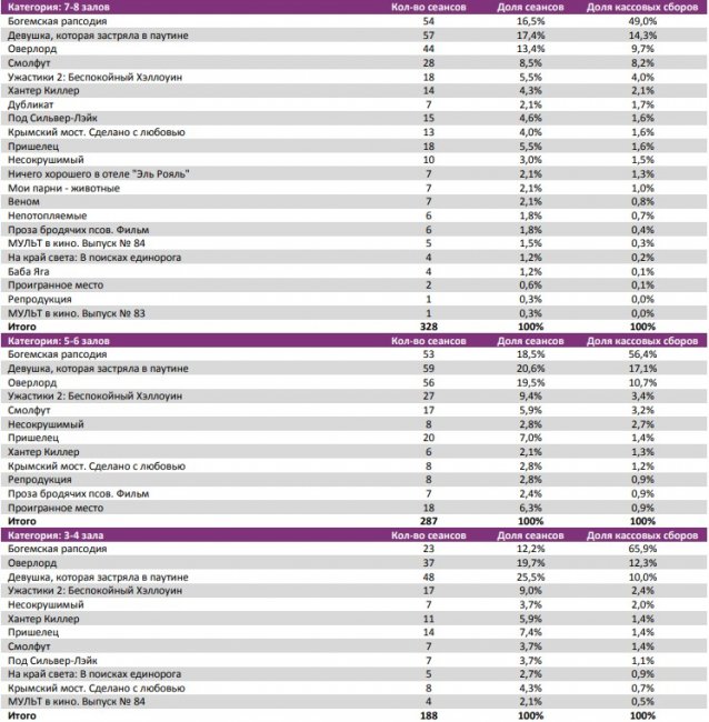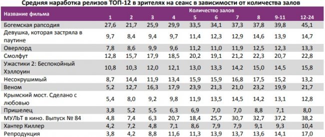 «Хантер Киллер» привлекал на сеанс меньше 11 зрителей. Еще ниже результаты у «Пришельца» - меньше 9 зрителей. У «Крымского моста» показатели от 5 до 15 зрителей на сеанс в зависимости от количества залов в кинотеатре.