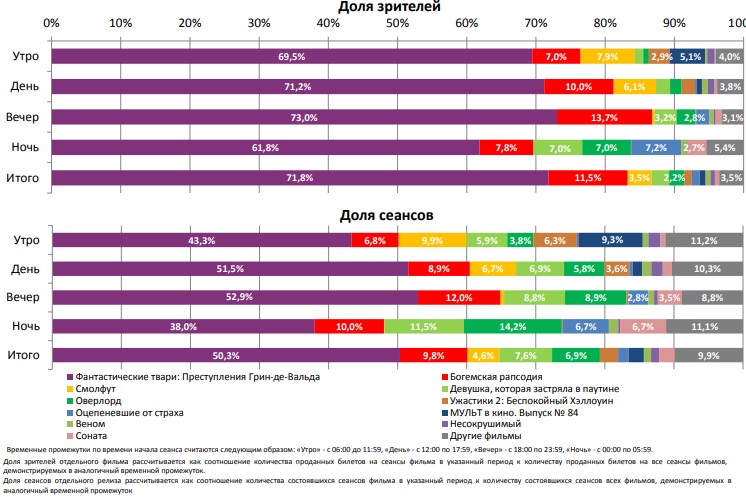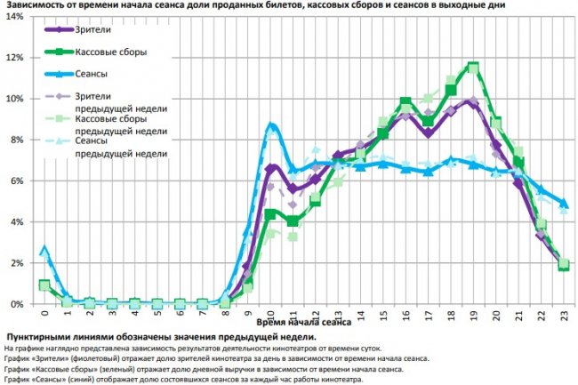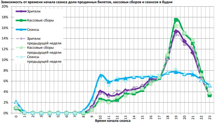 На графике указано распределение доли зрителей, сеансов и кассовых сборов по времени начала сеанса