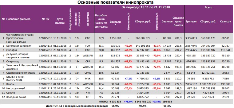 В топ-12 фильмов с лучшей наработкой вошли «Звезда родилась», «Веном» и «Ничего хорошего в отеле «Эль Рояль». Также в чарте два российских фильма – «Несокрушимый» и «Человек, который удивил всех».