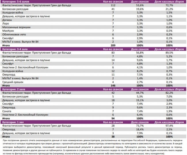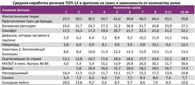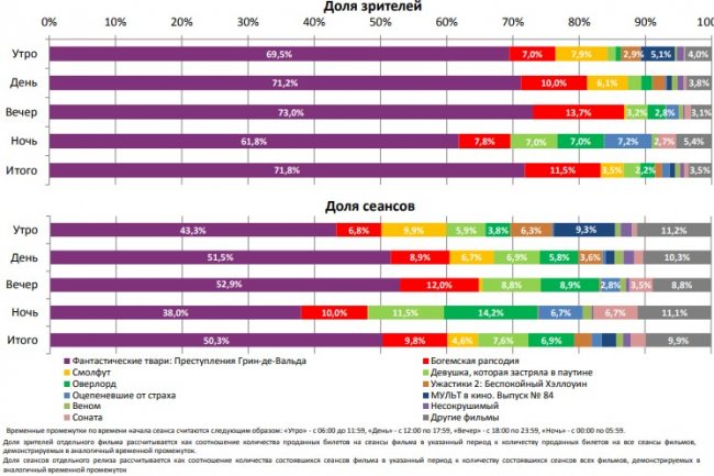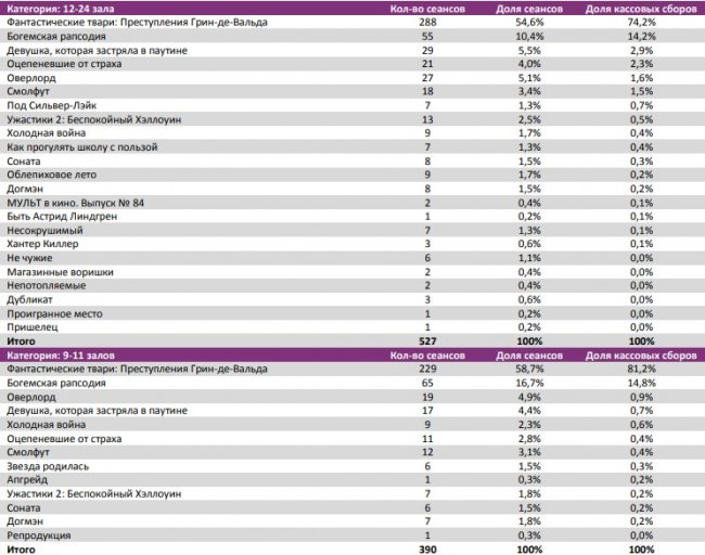 «Фантастические твари 2» в самых успешных кинотеатрах этой недели показали долю сборов 73-97%.