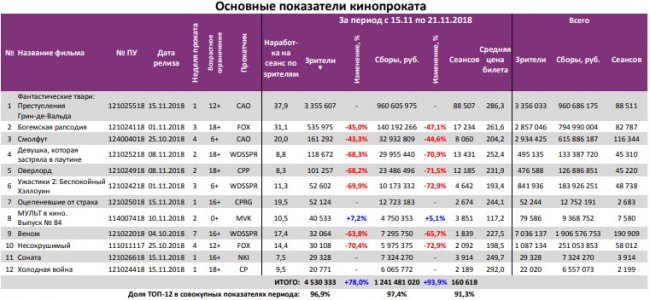 За стартовую неделю «Фантастические твари 2» заработали 960 млн рублей, что выше показателей первой части. К отметке в 800 млн рублей приблизилась «Богемская рапсодия». Свыше 7 млн билетов было продано на «Веном».