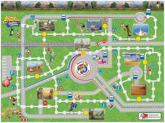 У настольной игры «Безопасный город» - несколько вариантов. В первом участникам предстоит доставить различные предметы на объекты (например, гантели - в спортзал, а мяч - во двор и т.д.), а во втором - собрать карточки с изображениями дорожных знаков. Такую карточку игрок сможет получить, попав на кружок с изображением персонажа. У каждого анимационного героя свой знак: например, у Стрелки - знак железнодорожного переезда, а у Казбека - предупреждающий об опасном участке дороги. Для детей более старшего возраста можно объединить первые два варианта, а также усложнить игру. Например, попросить игрока, получившего картинку с дорожным знаком, сказать его название.