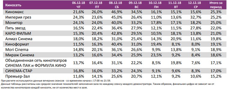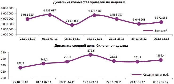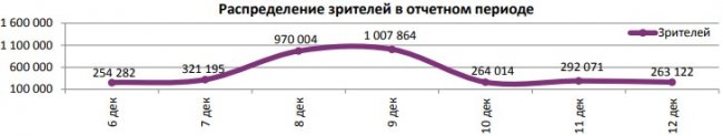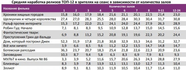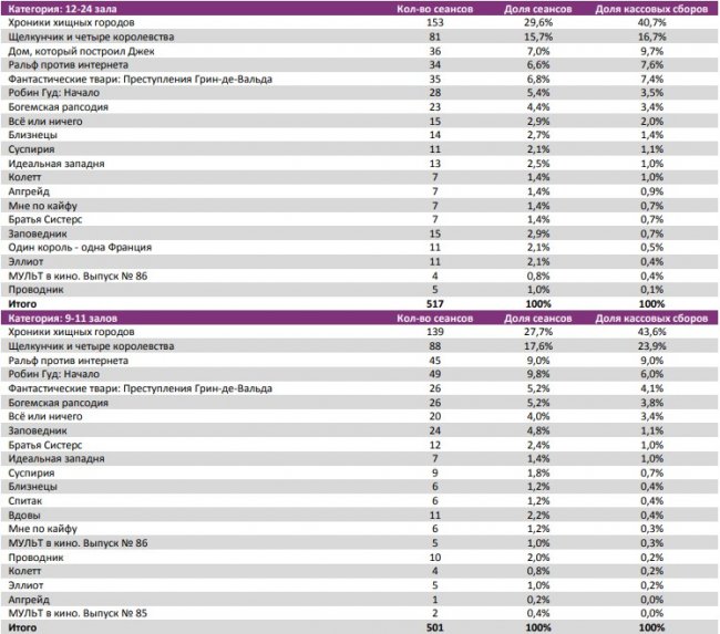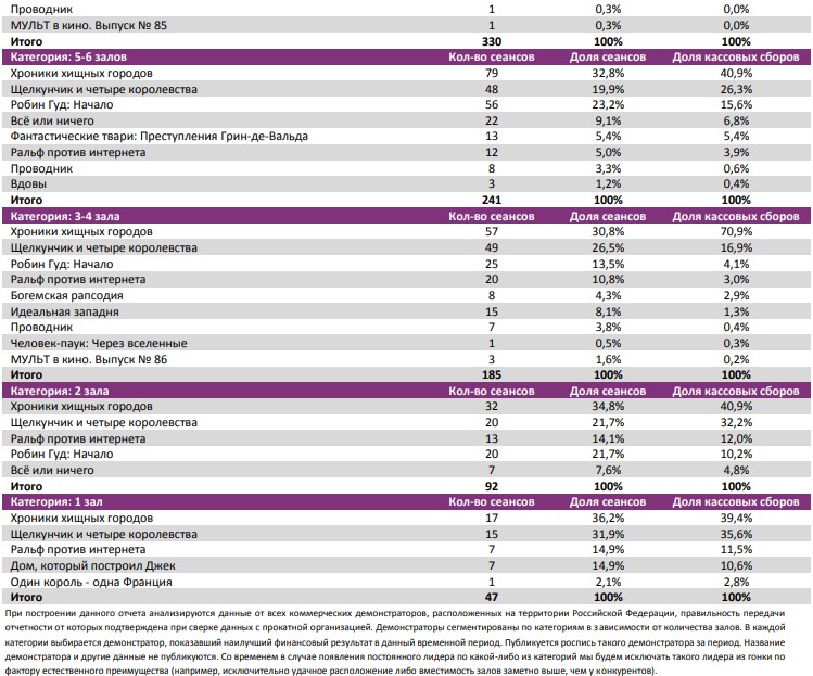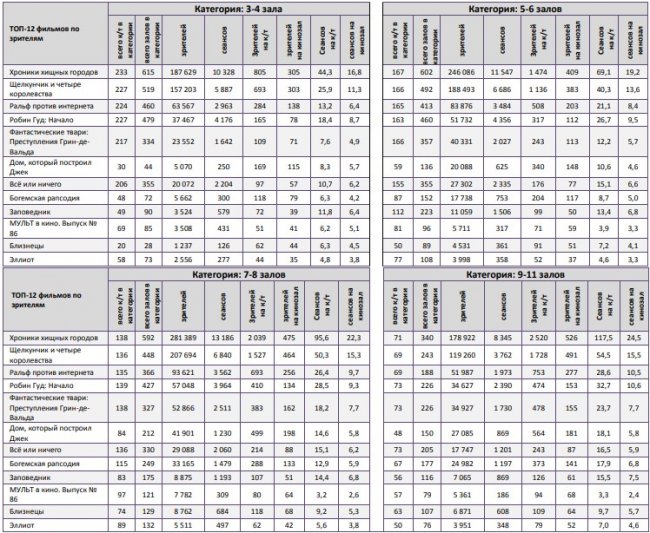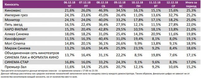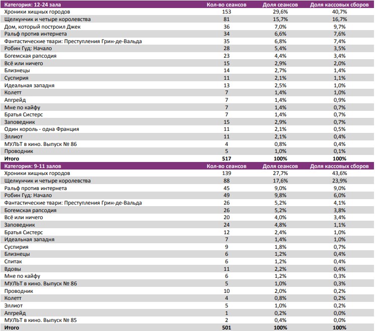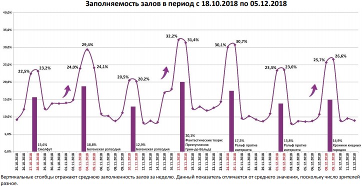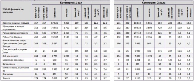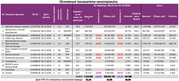 Как показывает индустриальная статистика с 6 по12 декабря (неделя №49), на второй неделе декабря посещаемость российских кинотеатров выросла на 300 тыс. зрителей. Почти 60% проданных билетов пришлось на долю двух новинок – «Хроники хищных городов» и «Щелкунчик и четыре королевства». «Хроники хищных городов» за первую неделю посмотрели 1,1 млн зрителей, а «Щелкунчика» за пять дней проката – 0,88 млн. Рубеж в 1,5 млрд рублей преодолел сиквел «Фантастических тварей». Лидером на наработке на сеанс стал фильм Ларса фон Триера «Дом, который построил Джек». Также в топ-12 драматические фильмы «Колетт», «Спитак» и «Братья Систерс». Средняя наработка на сеанс и заполняемость остались на прежнем уровне. Увеличение заполняемости наблюдалось в выходные дни. Репертуарное планирование кинотеатров с наибольшей выручкой за период «Хроники хищных городов» стали лидером во всех семи самых успешных кинотеатрах страны. Показатели работы кинотеатров в зависимости от количества залов по фильмам ТОП-12 Сразу 8 релизов были расписаны в более чем 150 однозальных кинотеатрах. Фильм-лидер недели: «Хроники хищных городов». Максимальную заполняемость на его сеансах показал «Киномакс». «Заповедник» привлекал менее 11 зрителей на сеанс. На графике указано распределение доли зрителей, сеансов и кассовых сборов по времени начала сеанса Статистика Фонда кино отражает информацию об основных результатах проката, лидерах недели по сборам и наработке на сеанс, показателях работы кинотеатров, эффективности репертуарного планирования, а также о соотношении долей по сборам, зрителям и сеансам в рамках данного периода. Подписывайтесь на наш Телеграм-канал.