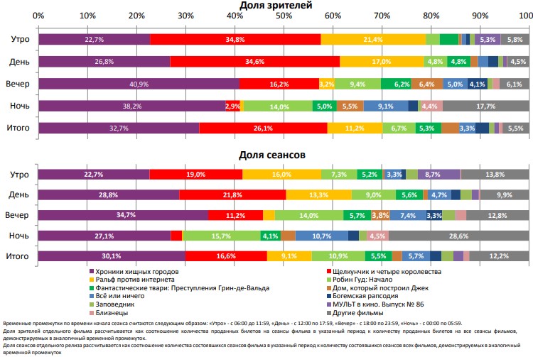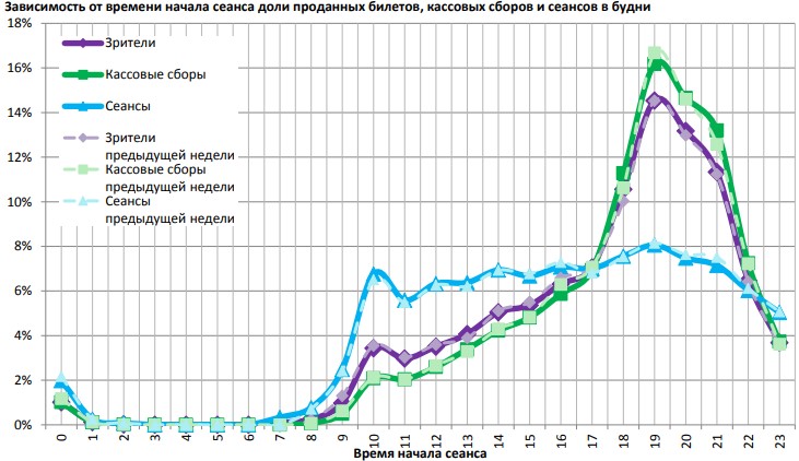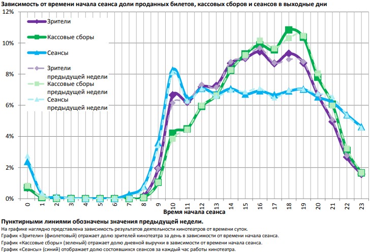 На графике указано распределение доли зрителей, сеансов и кассовых сборов по времени начала сеанса