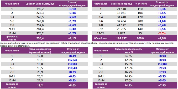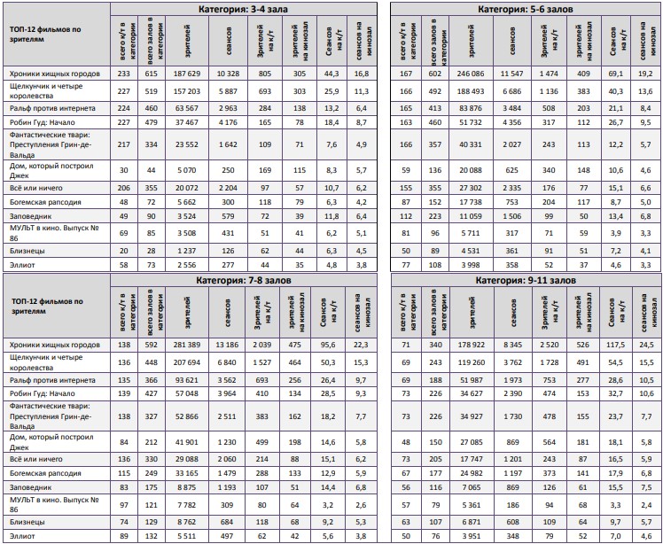 Показатели работы кинотеатров в зависимости от количества залов по фильмам ТОП-12