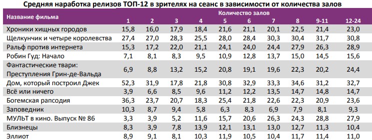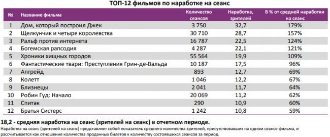 Лидером на наработке на сеанс стал фильм Ларса фон Триера «Дом, который построил Джек». Также в топ-12 драматические фильмы «Колетт», «Спитак» и «Братья Систерс».