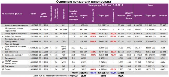Как показывает индустриальная статистика с 6 по12 декабря (неделя №49), на второй неделе декабря посещаемость российских кинотеатров выросла на 300 тыс. зрителей. Почти 60% проданных билетов пришлось на долю двух новинок – «Хроники хищных городов» и «Щелкунчик и четыре королевства».
