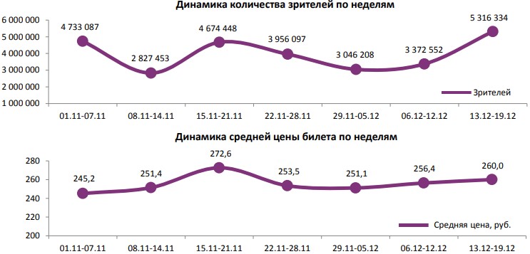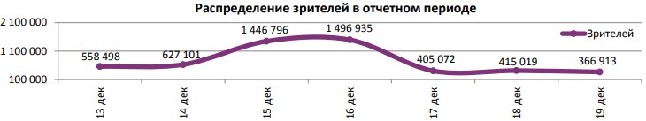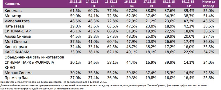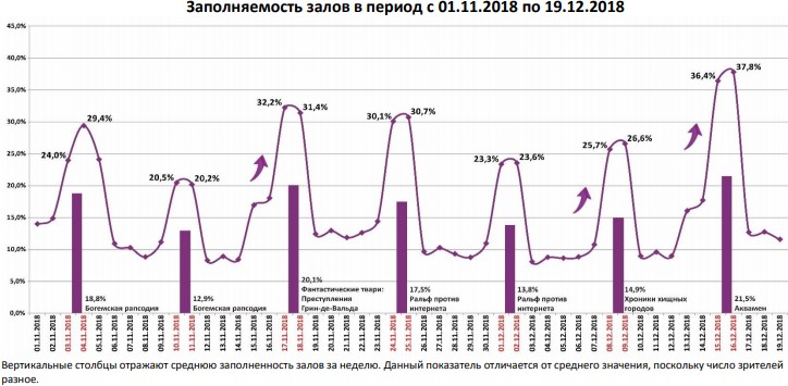 Пик заполняемости пришелся на воскресенье, что обусловлено наличием в репертуаре кинотеатров ряда картин, ориентированных на детскую и семейную аудиторию.