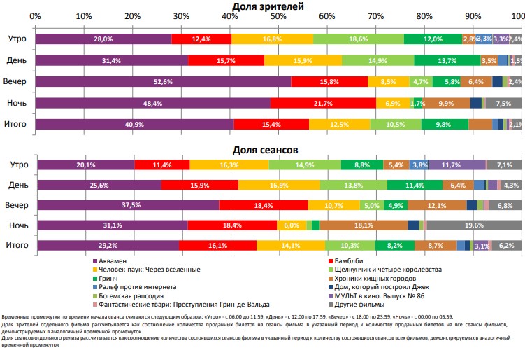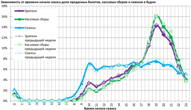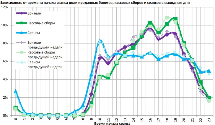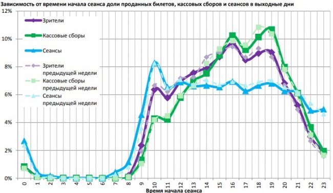 На графике указано распределение доли зрителей, сеансов и кассовых сборов по времени начала сеанса