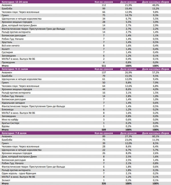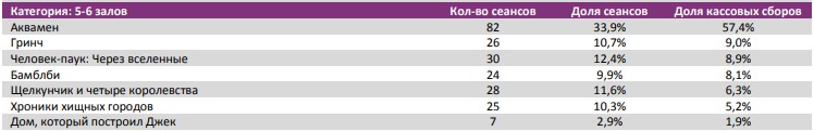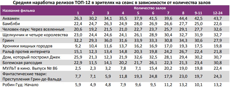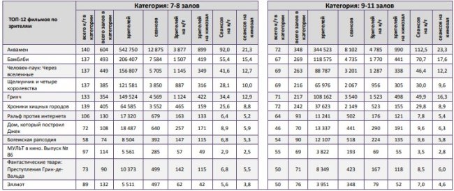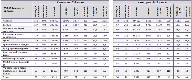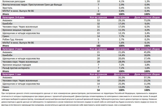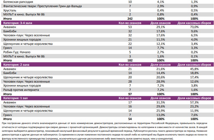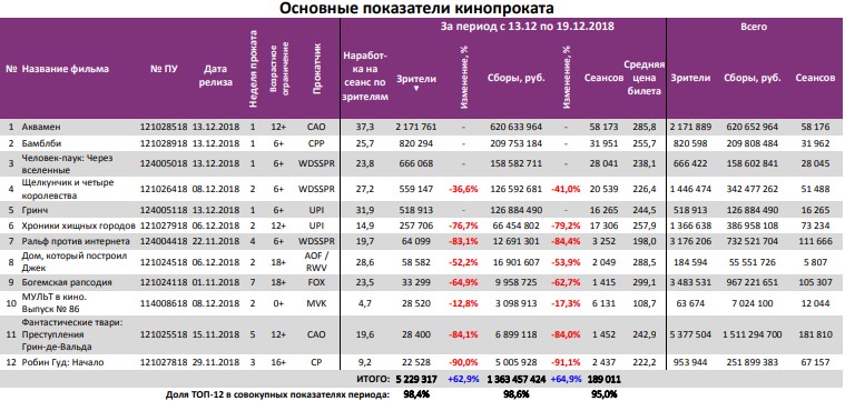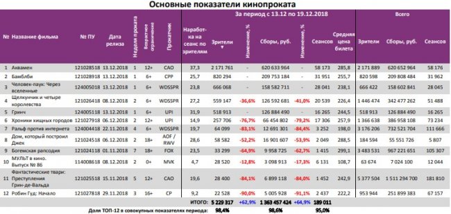 Фильм о супергерое вселенной DC «Аквамен» за первую неделю посмотрели 2,2 млн зрителей. Еще 1,5 млн пошли на спин-офф о трансформере «Бамблби» и анимационного «Человека-паука» - 0,82 млн и 0,66 млн зрителей соответственно. Несмотря на высокую конкуренцию за семейную аудиторию, неплохую динамику сохранил «Щелкунчик»: за вторую неделю проката фильм посмотрели 0,56 млн зрителей. С 5 строчки стартовал анимационный фильм «Гринч», демонстрирующий высокую наработку на сеанс по количеству зрителей.