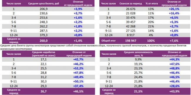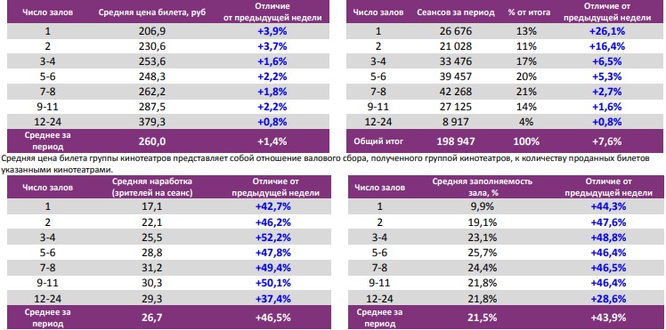 Средняя наработка на сеанс и заполняемость кинозалов выросли на 46% и 44% соответственно.