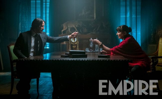 Empire показали свежий кадр из боевика «Джон Уик 3: Парабеллум» с участием Киану Ривза и новой героини в исполнении Анжелики Хьюстон – некоей таинственной женщины, известной как Рома Руска или «Директор», а также входящей в «Правление кланов».