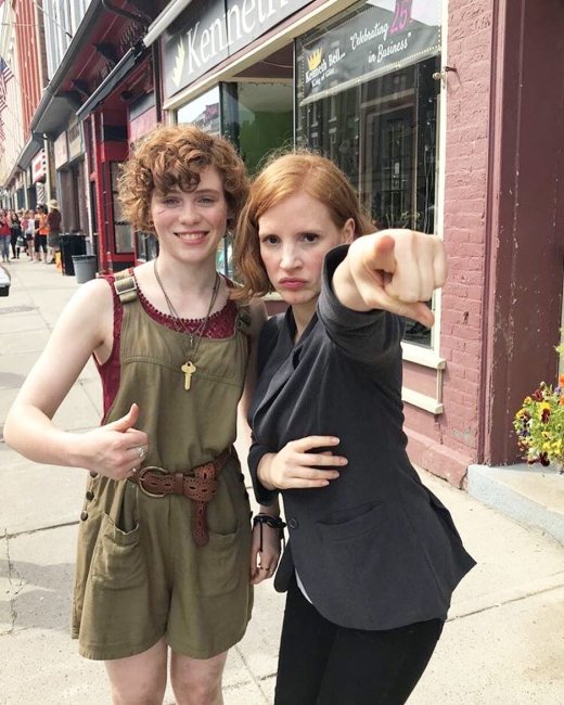 В Сети оказался новый кадр со съёмочной площадки фильма ужасов «Оно: Часть 2» по роману Стивена Кинга с участием исполнительниц роли Беверли Марш – Софии Лиллис и Джессики Честейн.