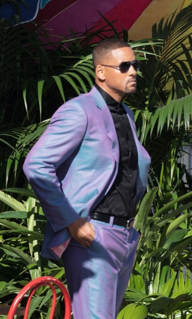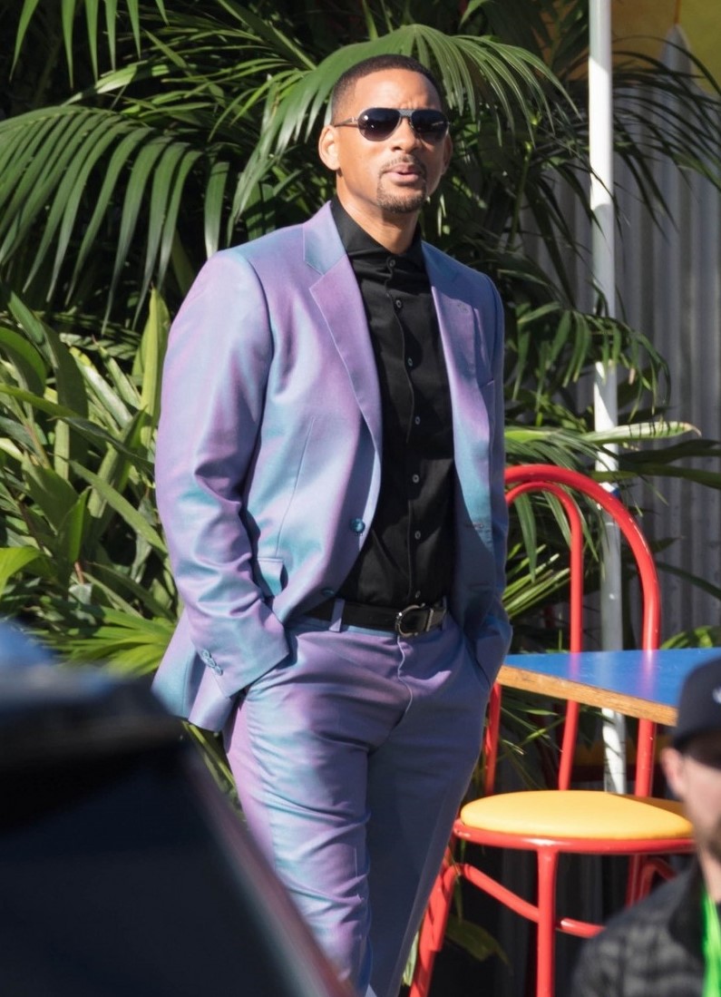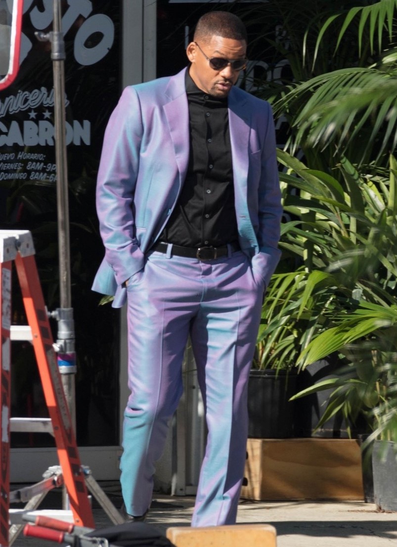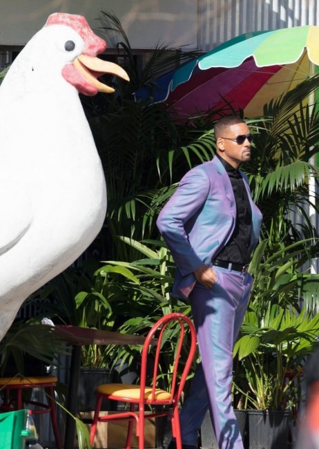 Появились свежие фото со съёмочной площадки триквела «Плохих парней» под названием «Плохие парни навсегда» с участием Уилла Смита в стильном пурпурном костюме.