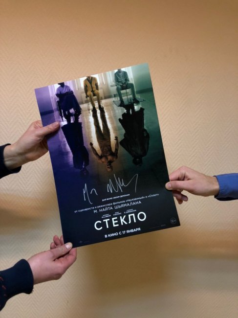 Мы разыгрываем 4 мини-постера «Стекла» с автографом режиссёра и 4 фирменных плаща-дождевика, как у персонажа Брюса Уиллиса!