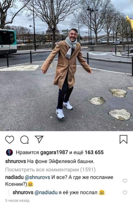 Сергей Шнуров тем временем отдыхает в Париже – он опубликовал фото на фоне Эйфелевой башни и подписал лаконично, без матерного стихотворения, к которым привыкли поклонники музыканта. На очередной вопрос о том, когда будет свежее послание Ксении Собчак, музыкант ответил, что он её «уже послал».