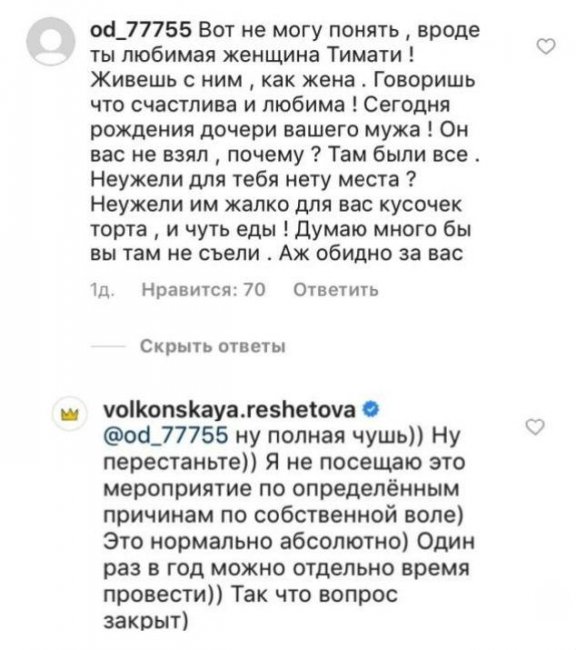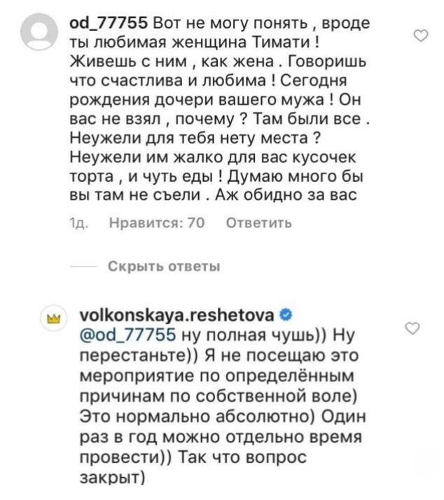 При этом модель часто отдыхает с дочкой Тимати. Она постоянно с ней общается и даже знакома с женщиной, которая занимается с маленькой Алисой развивающими играми. Под одним из новых постов Анастасии поклонники выразили свое негодование. Они заподозрили, что это сам Тимати запрещает своей возлюбленной присутствовать на праздниках его дочери, чтобы не смущать Шишкову. «Он вас не взял, почему? Там были все. Неужели для тебя нет места? Неужели им жалко для вас кусочек торта, и чуть еды!», — поинтересовалась одна из подписчиц.