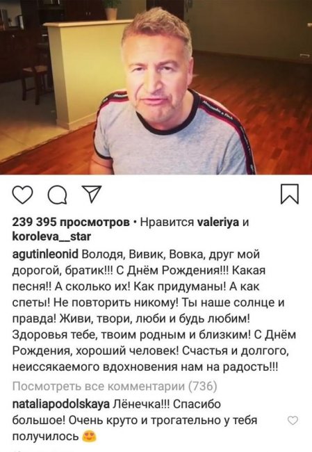 «Ты наше солнце и правда! Живи, твори, люби и будь любим! Здоровья тебе, твоим родным и близким! С Днём Рождения, хороший человек! Счастья и долгого, неиссякаемого вдохновения нам на радость!» – написал Леонид Агутин.