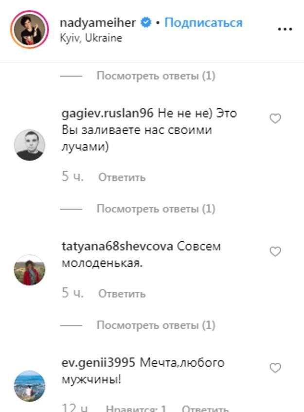 «Совсем молоденькая…», «Мечта любого мужчины!», «Наденька, солнышко от вас исходит», «Шикарная женщина! От чистого сердца», «Богиня!!» — такие комментарии появились под фото Надежды Мейхер-Грановской на ее личной страничке в микроблоге.