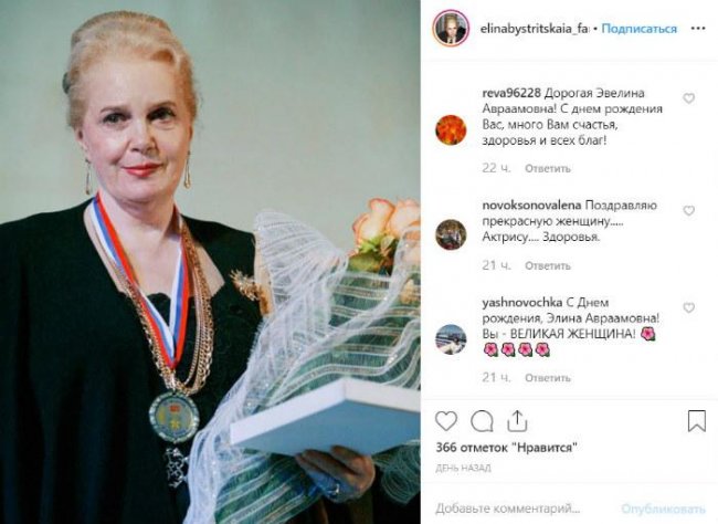 «Любимая актриса! Неповторимая!», «Моей дочери в этом году будет 36 лет. Ее зовут Элина, в Вашу честь», «Моя дорогая и любимая. Здоровья Вам до 120», «С Днем рождения! Здоровья, радости, благополучия, мира, добра, будьте счастливы! Вы моя самая любимая актриса!», «С Днем рождения, Элина Авраамовна! Вы – великая женщина!», – пишут пользователи Instagram.