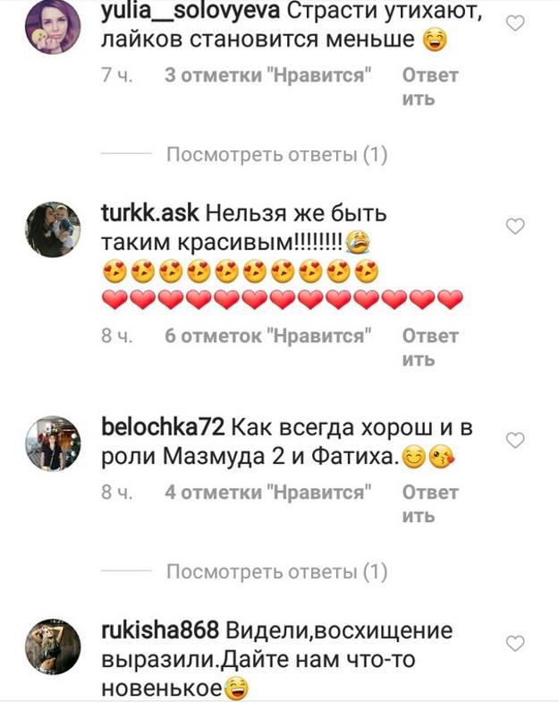 «Страсти утихают, лайков становится меньше», «Нельзя же быть таким красивым», «Как всегда хорош!», «Видели, восхищение выразили! Дайте нам что-нибудь новенькое», — такие комментарии появились под снимком Али Эрсана Дуру.